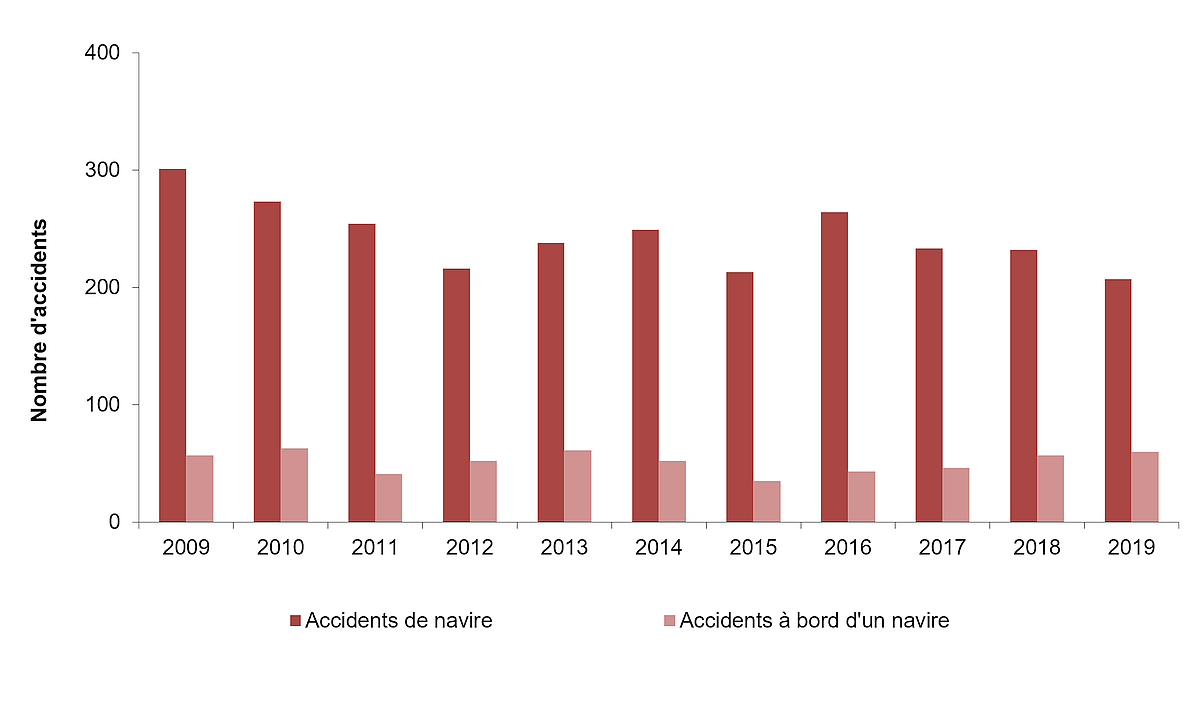 En 2019, on a recensé 17 pertes de vie signalées, en baisse des 22 pertes de vie signalées en 2018, mais au-delà de la moyenne décennale de 15,2 (2009-2018). De ces 17 pertes de vie, 4 ont été liées à 3 accidents de navigation, tandis que les 13 autres étaient liées à 10 accidents à bord de navires (figure 2).