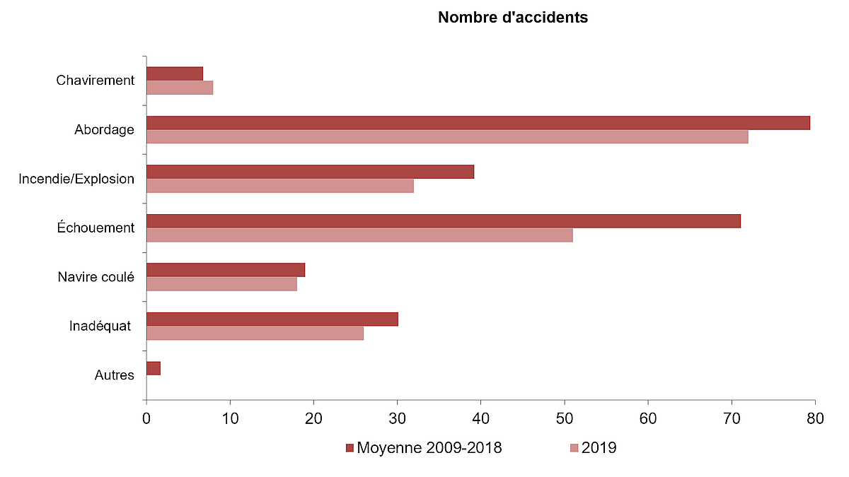 On a enregistré 207 accidents de navigation en 2019, un nombre inférieur à celui de 2018 qui était de 232, et inférieur de 16 % à la moyenne de 2009 à 2018 (247). La plupart des accidents de navigation mettaient en cause des bateaux de pêche (29 %) et des navires qui transportent des cargaisons solides (27 %).