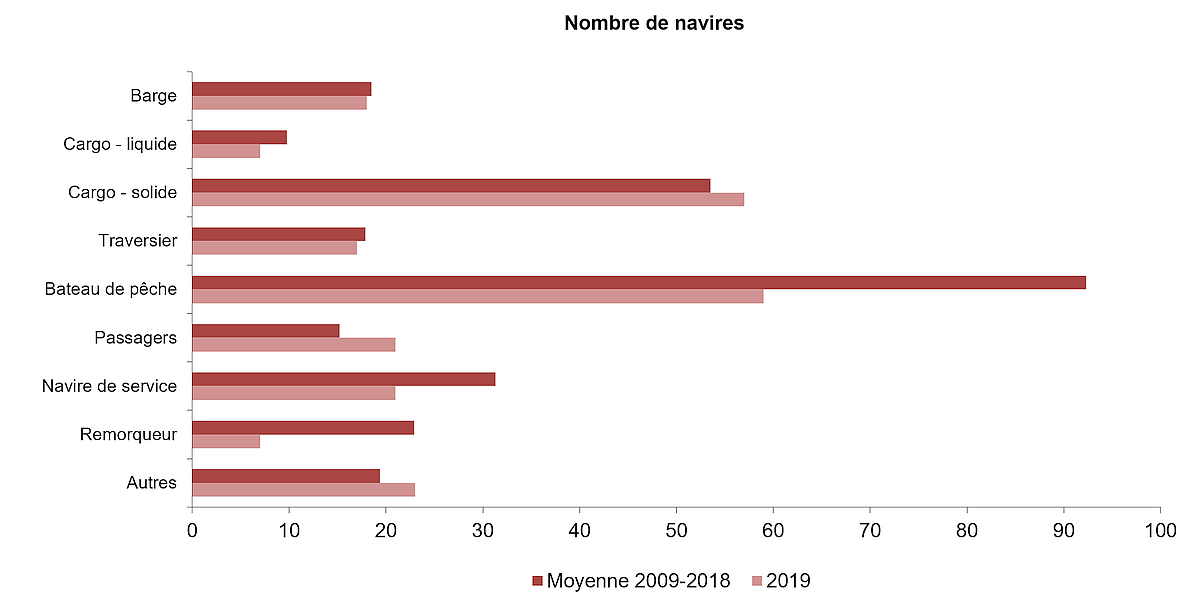 En 2019, 79 % des 230 navires en cause dans des accidents de navigation signalés au BST étaient des navires canadiens. De ces bateaux canadiens, 49 % étaient des navires de commerce autres que des bateaux de pêche, 35 % étaient des bateaux de pêche, et la dernière tranche de 16 % comprenait des navires non commerciaux, des embarcations de plaisance ou des navires de service.