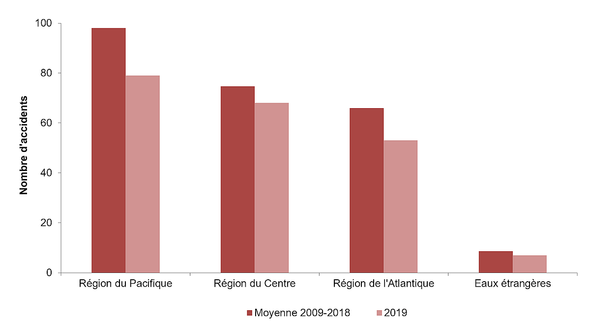 En 2019, 38 % des accidents de navigation sont survenus dans la région du Pacifique, 33 % dans la région du Centre et 26 % dans la région de l’Atlantique. La tranche restante de 3 % vise des accidents de navigation survenus dans des eaux étrangèresNote de bas de page 2. En 2019, dans la région du Pacifique, le nombre d’accidents de navigation a diminué de 19 % par rapport à la moyenne durant la période de 2009 à 2018. Dans la région du Centre, ce type d’accident a reculé de 9 % par rapport à la moyenne de 2009 à 2018. Dans la région de l’Atlantique, le nombre d’accidents de navigation a été inférieur de 20 % à la moyenne de 2009 à 2018 (figure 5).
