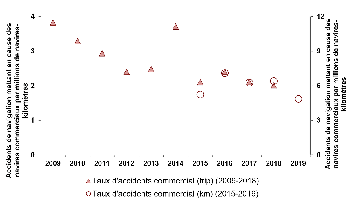 D’après les renseignements fournis par Transports Canada, l’activité maritime des navires de commerce canadiens autres que des bateaux de pêche dont la jauge brute est de plus de 15 (à l’exclusion des navires à passagers et des navires de croisière) a été estimée à 14 185 milliers de navires-kilomètres commerciaux en 2019. Cela constitue une hausse de 12 % comparativement à la moyenne de la période 2015–2018Note de bas de page 3. En 2019, le taux d’accidents s’est donc établi à 4,9 accidents de navigation par million de navires-kilomètres, en baisse comparativement à la moyenne des 4 années précédentes (6,3). (Remarque : une suite de 5 ans est trop courte pour remarquer des tendances.)