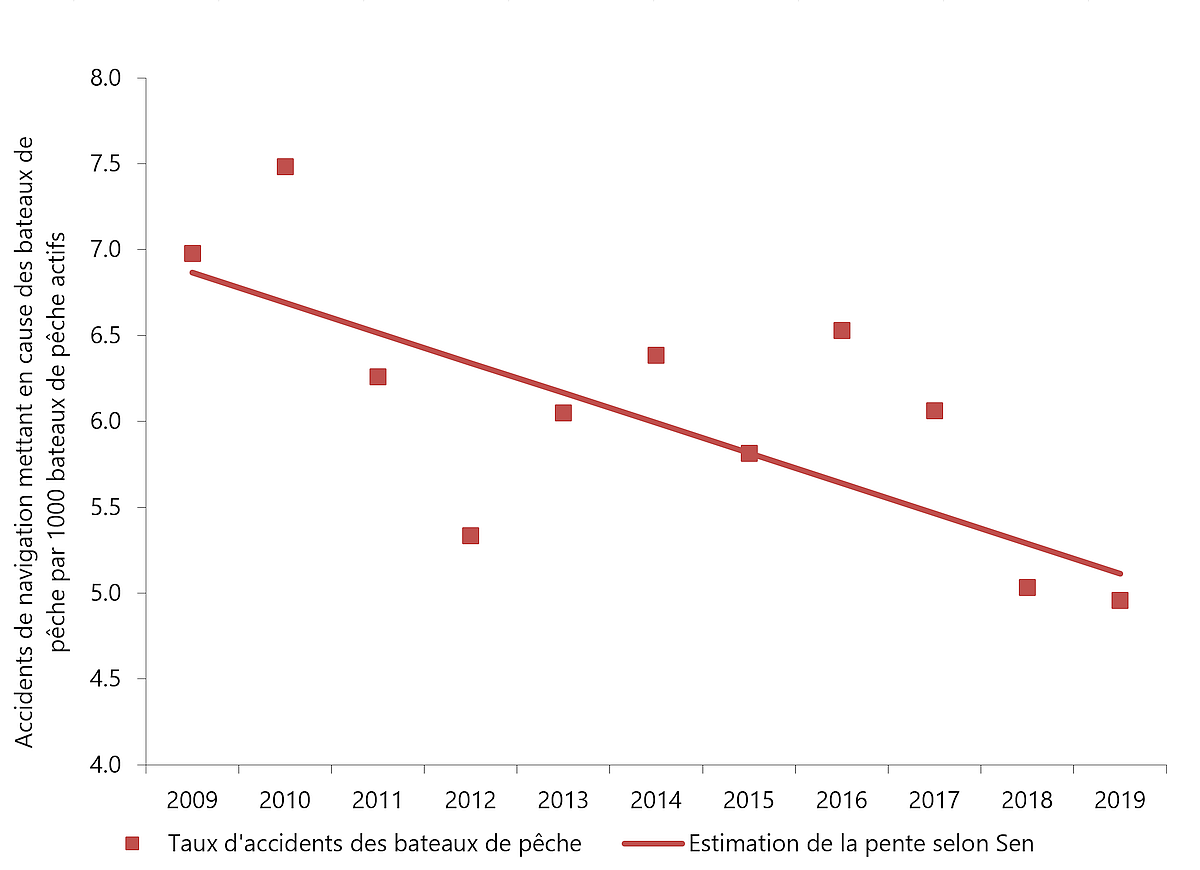 | Année | Taux d'accidents des bateaux de pêche | Estimation de la pente selon Sen |