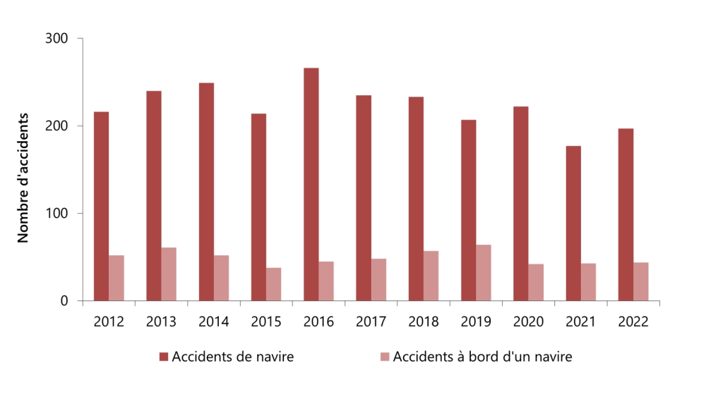 On a enregistré 197 accidents de navigation en 2022, un nombre supérieur à celui de 2021, qui était de 177, mais inférieur de 13 % à la moyenne de 2012 à 2021 (226). La plupart des accidents de navigation mettaient en cause des bateaux de pêche (30 %) et des navires qui transportent des cargaisons solides (23 %) (données non présentées).