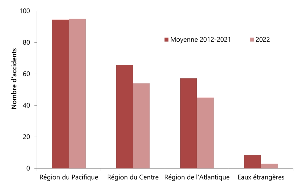 En 2022, 48 % des accidents de navigation sont survenus dans la région du Pacifique, 27 % dans la région du Centre et 23 % dans la région de l’Atlantique. Moins de 2 % des accidents de navigation sont survenus dans des eaux étrangèresNote de bas de page 2. En 2022, dans la région du Pacifique, le nombre d’accidents de navigation est demeuré inchangé par rapport à la moyenne durant la période de 2012 à 2021. Dans la région du Centre, ce type d’accident a diminué de 18 % par rapport à la moyenne de 2012 à 2021. Dans la région de l’Atlantique, le nombre d’accidents de navigation a été inférieur de 21 % à la moyenne de 2012 à 2021 (figure 5).