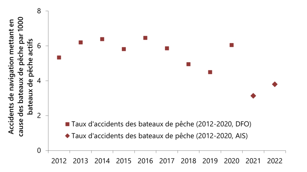 | Année | Taux d'accidents des bateaux de pêche (2012-2020, DFO) | Taux d'accidents des bateaux de pêche (2012-2020, AIS) |
