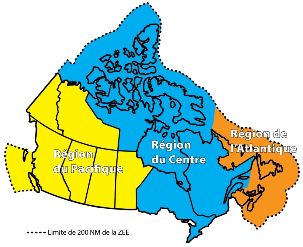 La région du Pacifique comprend la Colombie-Britannique, l’Alberta, la Saskatchewan, le Manitoba, le Yukon et les Territoires du Nord-Ouest au sud du 70e parallèle, ainsi que les eaux adjacentes à ces provinces et territoires jusqu’à la limite de 200 NM de la zone économique exclusive (ZEE) (ou jusqu’à la limite maritime d’un autre État).