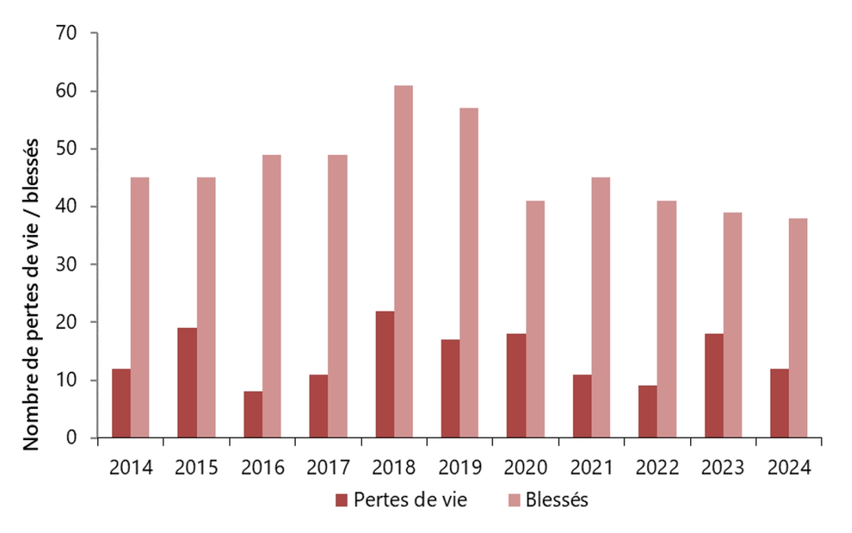En 2024, le nombre de blessés graves (38) a légèrement baissé par rapport à celui de 2023 (39) et à la moyenne annuelle pour la période de 2014 à 2023 (47). En tout, 30 des 38 blessés graves (79 %) ont été victimes d’accidents à bord d’un navire, et 8 ont été victimes d’accidents de navigation (figure 2).