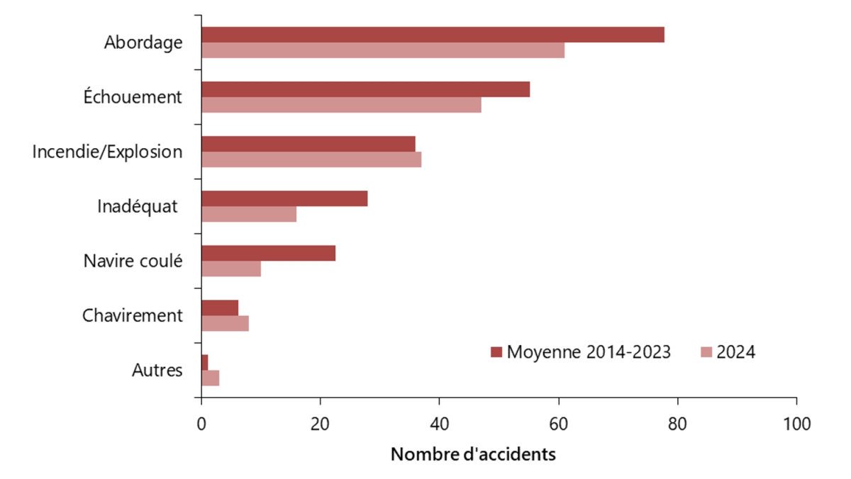 | Nombre d'accidents de navire par type d'accident | Moyenne 2014-2023 | 2024 |