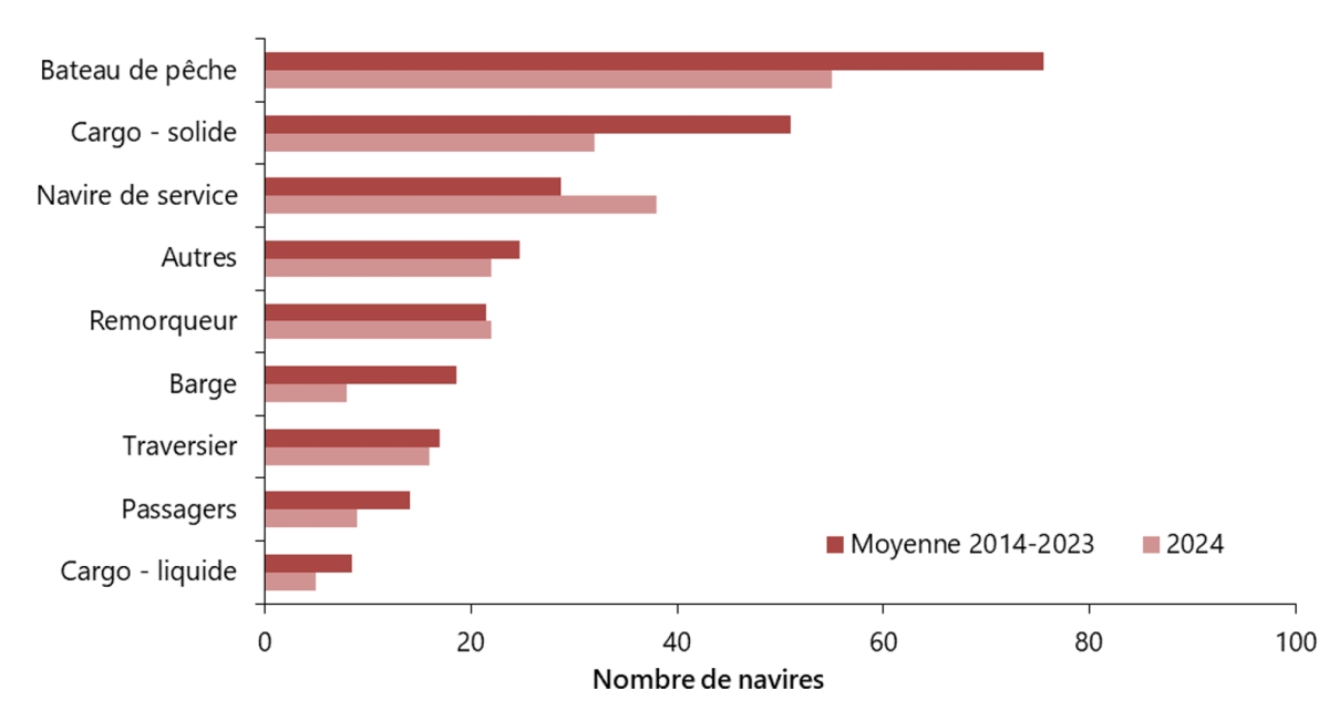 En 2024, 78 % des 207 navires mis en cause dans des accidents de navigation signalés au BST étaient des navires canadiens. Parmi ces 161 navires battant pavillon canadien, 41 % étaient des navires de commerce autres que des bateaux de pêche, 34 % étaient des bateaux de pêche, et la dernière tranche de 25 % comprenait des navires de service (38), des navires hydrographiques/de recherche (2) ou des voiliers (1).
