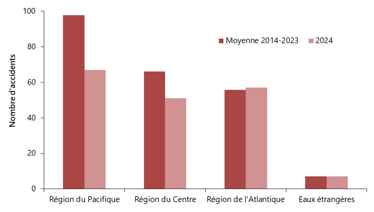 En 2024, 37 % des accidents de navigation sont survenus dans la région du Pacifique, 31 % dans la région de l’Atlantique et 28 % dans la région du Centre. Moins de 4 % des accidents de navigation sont survenus dans des eaux étrangèresVoir la section Définitions.. En 2024, dans la région du Pacifique, le nombre d’accidents de navigation (67) a diminué de 31 % par rapport à la moyenne pour la période de 2014 à 2023 (98). Dans la région du Centre, le nombre d’accidents de navigation (51) a été inférieur de 23 % par rapport à la moyenne de 2014 à 2023 (66), tandis que dans la région de l’Atlantique, le nombre d’accidents de navigation (57) était proche de la moyenne de 2014 à 2023 (56) (figure 5).