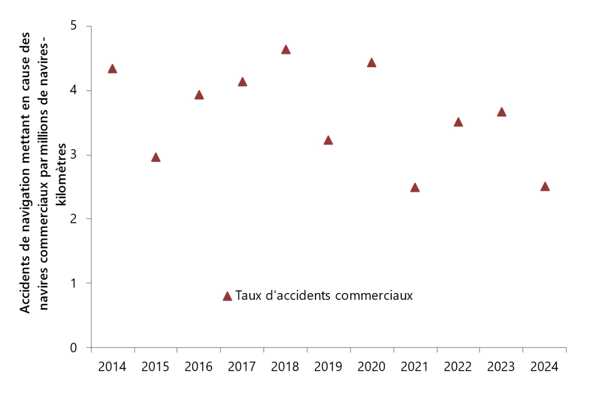 En 2024, dans le cas des navires de commerce battant pavillon canadien autres que les bateaux de pêche, les abordages (45 %), les échouements (21 %) et les incendies et explosions (17 %) ont été les principaux types d’accidents (tableau 3). D’après les renseignements fournis par Transports CanadaTC combine les données du système d’identification automatique (SIA) terrestre de la Garde côtière canadienne et les données du SIA par satellite provenant du fournisseur de SIA par satellite du gouvernement du Canada, afin d’obtenir une mesure complète et détaillée basée sur la distance parcourue lors de l’activité maritime commerciale battant pavillon canadien dans les eaux canadiennes. (Source 1. Transports Canada, « An introduction to automatic identification system (AIS) data and how it’s used at TC (OPP) » (décembre 2019). Source 2. Transports Canada, Analyse économique des transports – Groupe des politiques, communication par courriel le 20 mars 2025). et les évaluations du BSTLes données fournies par TC ne prennent pas en compte l’activité de tous les navires de commerce d’une jauge brute inférieure à 300, qui ne sont pas tenus d’être équipés d’un SIA. Par conséquent, le BST estime les kilomètres-navires pour tous les navires de commerce d’une jauge brute inférieure à 300 en appliquant les résultats d’un levé aérien — exécuté de 2015 à 2017 — des navires équipés ou non d’un SIA (Serra-Sogas et al., 2021) aux données sur l’activité basées sur les SIA fournies par TC. (Source : N. Serra-Sogas, P. O’Hara, K. Pearce, L. Smallshaw et R. Canessa, « Using aerial surveys to fill gaps in AIS vessel traffic data to inform threat assessments, vessel management and planning », Marine Policy, vol. 133 (2021), à l’adresse https://doi.org/10.1016/j.marpol.2021.104765), l’activité maritime des navires de commerce canadiens autres que des bateaux de pêche dont la jauge brute est de plus de 15 (à l’exclusion des navires à passagers et des navires de croisière) a été estimée à 13,971 millions de navires-kilomètres commerciaux en 2024, nombre inchangé par rapport à la moyenne de 2014 à 2023. Le taux est donc de 2,5 accidents de navigation par million de navires-kilomètres en 2024, soit une baisse par rapport à la moyenne décennale précédente de 3,7.
