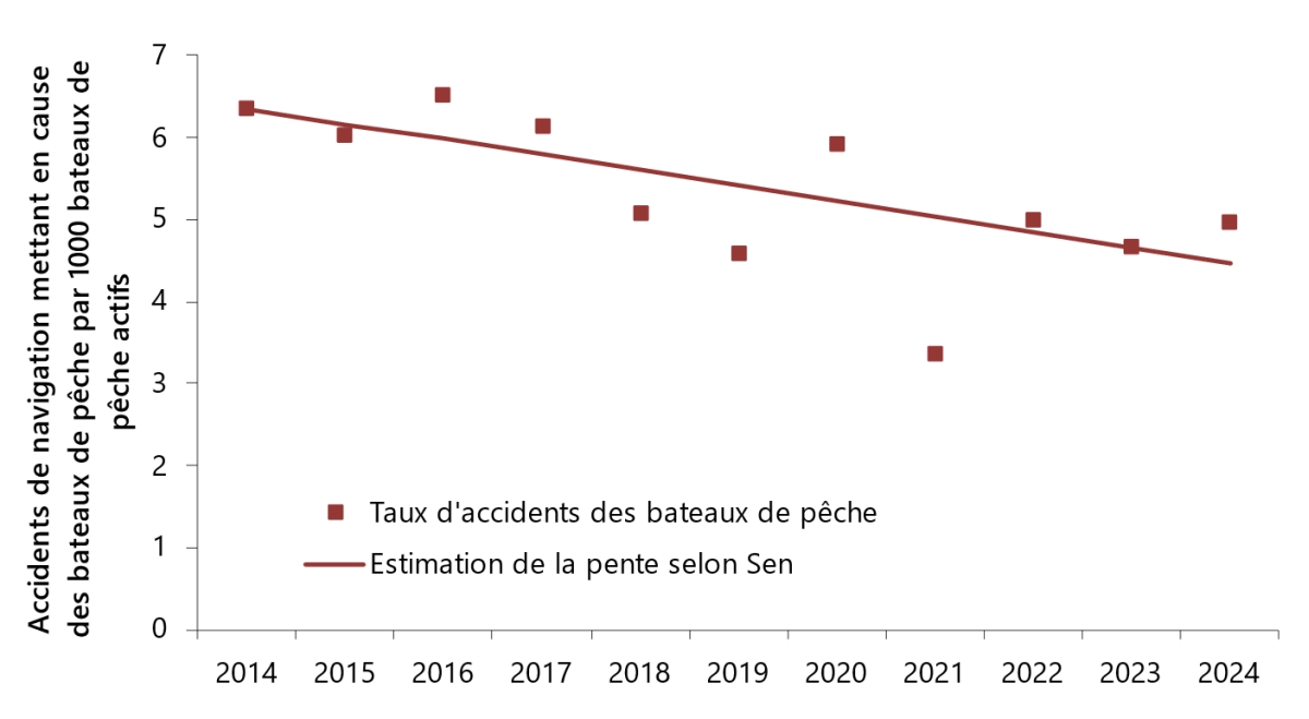 On a employé le coefficient de corrélation tau-b (τb) de Kendall et la pente estimée selon la méthode de Sen pour quantifier la tendance du taux d’accidents des bateaux de pêche indiquée à la figure 7. Le coefficient de corrélation τb de Kendall est une mesure non paramétrique de la force et de la direction d’association qui existe entre deux variables. On a calculé le τb de Kendall pour la série de valeurs des taux d’accidents par année sur 11 ans, de 2014 à 2024. Il y avait une corrélation négative relativement forte qui indique une tendance à la baisse du taux d’accidents des bateaux de pêche canadiens au cours de cette période (τb = −0,564, p = 0,016). La pente estimée selon la méthode de Sen, soit l’ampleur du changement à la baisse du taux par année, était de −0,188 accident par 1000 bateaux de pêche canadiens.