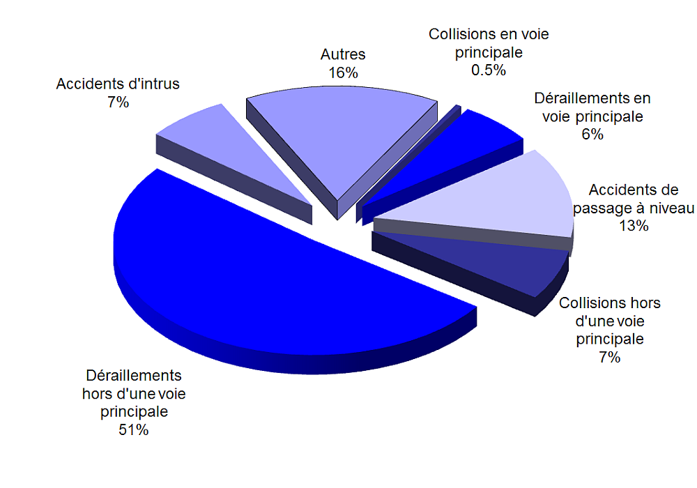 Les collisions et les déraillements en voie principale constituent les catégories d'accidents ferroviaires les plus graves au point de vue des risques pour le public et des pertes financières (trains de voyageurs en cause ou marchandises dangereuses se déversant de trains qui déraillent dans un secteur à forte densité de population).