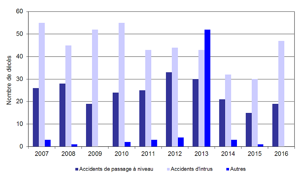 Les accidents ferroviaires ont entraîné la mort de 66 personnes en 2016, une hausse par rapport aux 46 décès enregistrés en 2015, mais une basse par rapport à la moyenne quinquennale et décennale de 76 et 78, respectivement. Il y a eu 19 pertes de vie aux passages à niveau en 2016, une hausse par rapport aux 15 pertes de vie enregistrées en 2015, mais une baisse par rapport aux moyennes quinquennale et décennale de 25 (figure 3). En 2016, 47 intrus ont perdu la vie Note de bas de page 5 au cours d'accidents, une hausse par rapport aux 30 pertes de vie en 2015 et à la moyenne de 38 des 5 dernières années, mais un nombre presque égal à la moyenne décennale de 46. En 2016, aucun employé des chemins de fer n'a été mortellement blessé, ce qui est inférieur à la moyenne quinquennale de 3 et à la moyenne décennale de 2.