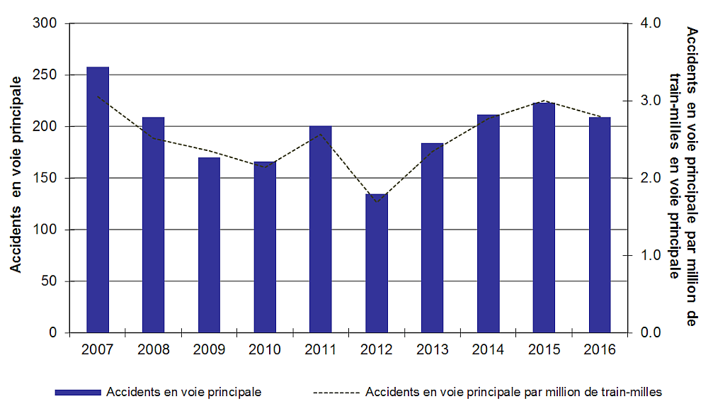 Le nombre de déraillements en voie principale par million de trains-milles est passé à 0,8 en 2016, ce qui constitue une baisse par rapport à 1,0 l'année précédente et à la moyenne quinquennale de 1,1.