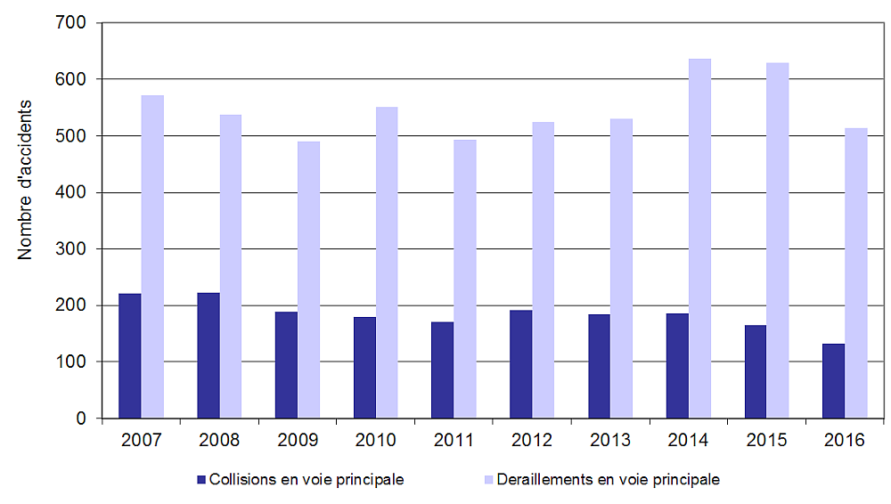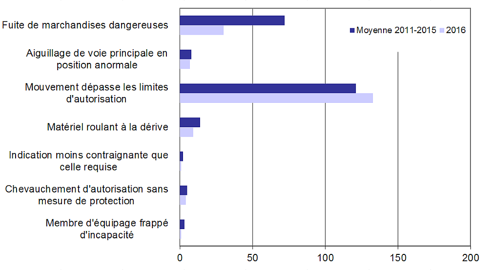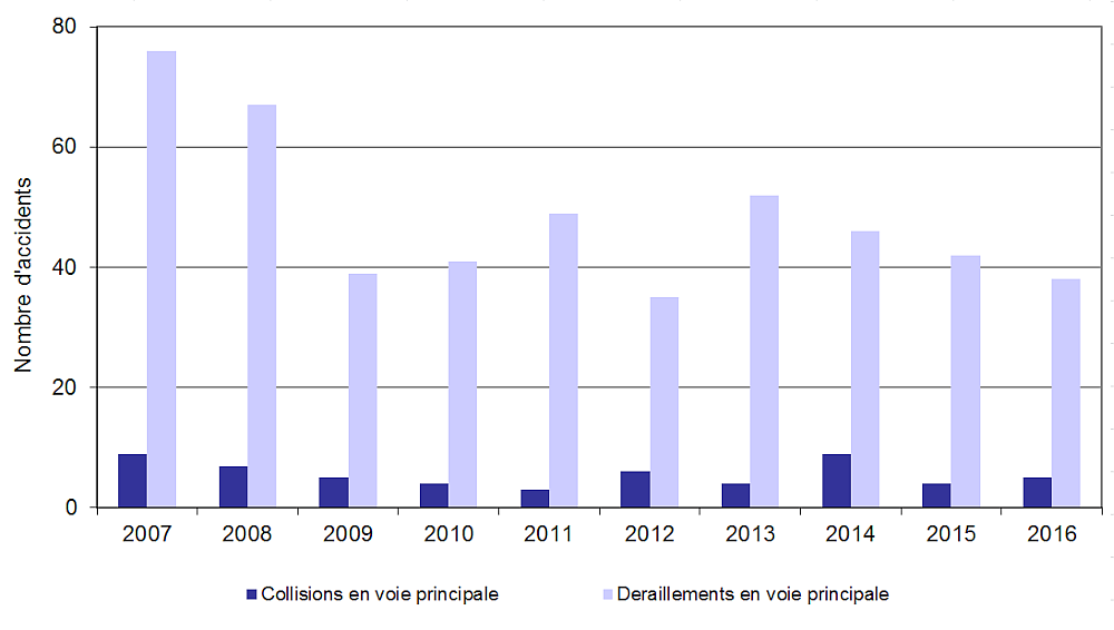 En 2016, il y a eu 10 déraillements en voie principale mettant en cause des marchandises dangereuses, ce qui constitue une baisse par rapport à 12 en 2015 et à la moyenne quinquennale de 15. Ces déraillements n'ont pas entraîné de rejet de produit.