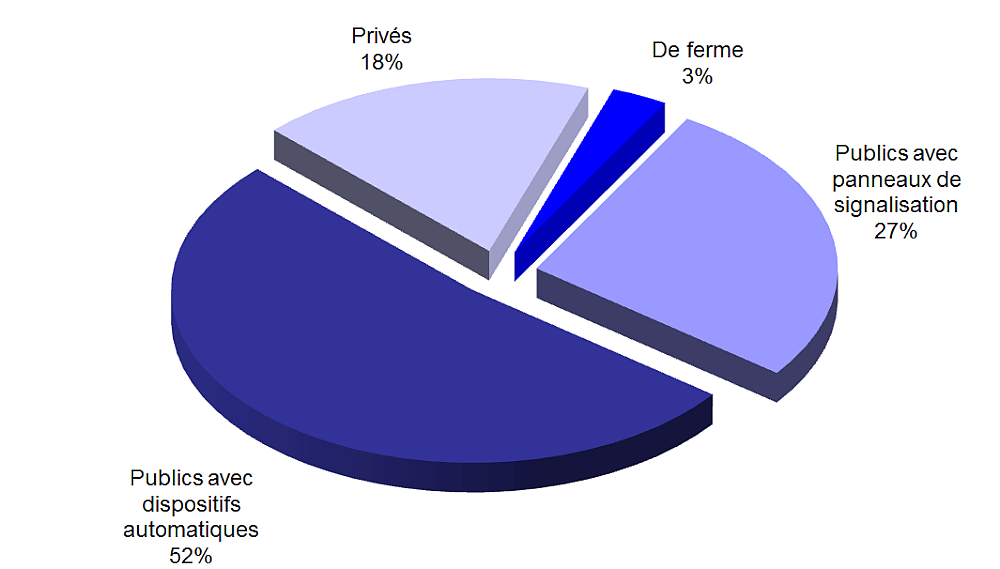 En 2016, la proportion d'accidents aux passages à niveau publics munis de dispositifs de signalisation automatiques a été de 52 %, comparativement à 27 % aux passages à niveau publics passifs (figure 8). Bien qu'il y ait presque 2 fois plus de passages à niveau publics sans dispositif de signalisation automatique que de passages à niveau publics dotés de dispositifs de signalisation automatiques, le nombre plus élevé d'accidents aux passages munis de dispositifs de signalisation automatiques est attribuable, en partie, au trafic routier et au trafic ferroviaire plus important à ces passages à niveau.