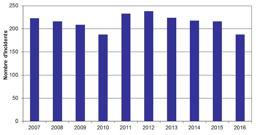 Il y a eu 188 incidents ferroviaires signalés en 2016 (figure 11), ce qui constitue une baisse par rapport aux 216 incidents ferroviaires enregistrés en 2015 et aux moyennes quinquennale et décennale de 226 et 218, respectivement. Les mouvements dépassant les limites d'autorisation Note de bas de page 12 (71 % des incidents à signaler) demeurent le principal type d'incident depuis 2007, suivis des fuites de matières dangereuses (16 %), du matériel roulant parti à la dérive (5 %) et des aiguillages de voie principale en position anormale (4 %).