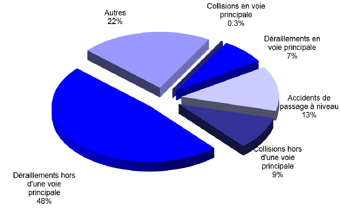 Les collisions et les déraillements en voie principale constituent les catégories d'accidents ferroviaires les plus graves au point de vue des risques pour le public et des pertes financières (trains de voyageurs en cause ou marchandises dangereuses se déversant de trains qui déraillent dans un secteur à forte densité de population).