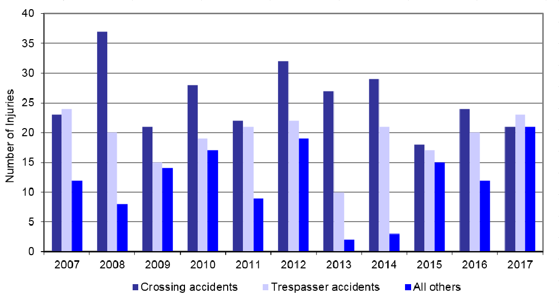Les trains de marchandises représentent environ 34 % de tous les trains en cause dans des accidents ferroviaires en 2017. Cinq pour cent (55 au total) étaient des trains de voyageurs, les 61 % qui restent étant principalement constitués de wagons isolés ou de rames de wagons, de locomotives et de véhicules d'entretien.