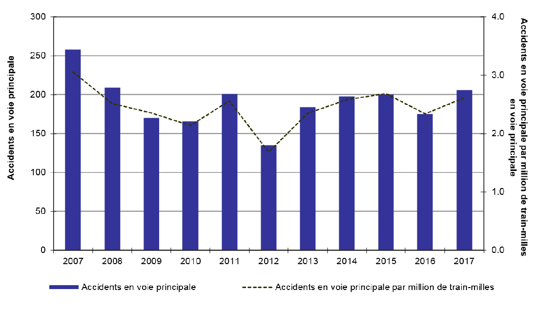 Le nombre de déraillements en voie principale par million de trains-milles a été de 1,03 en 2017, ce qui représente une hausse par rapport à 0,78 l'année précédente, mais une baisse par rapport à la moyenne sur 10 ans de 1,19.