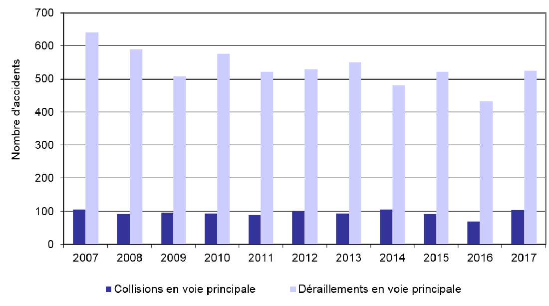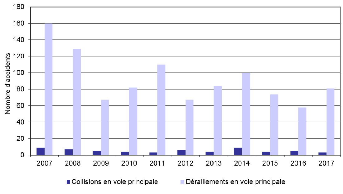 La proportion des accidents de déraillement ou de collisions en voie principale en 2017 était à peu près la même que pour l'année précédente et la moyenne sur 10 ans.