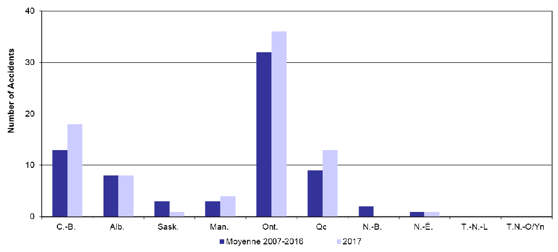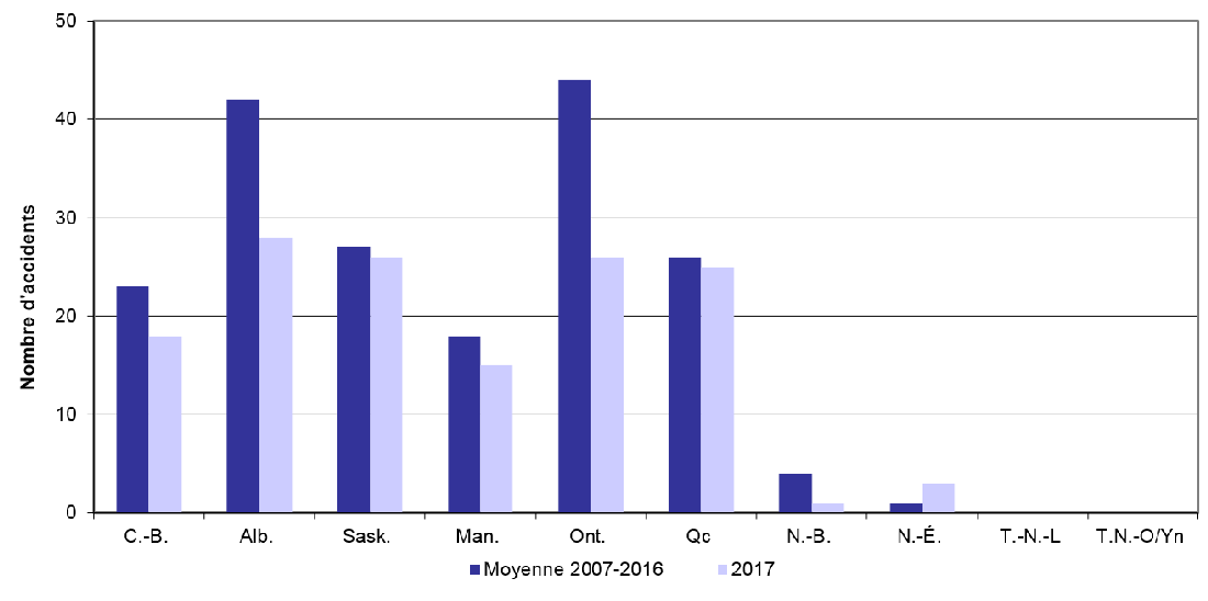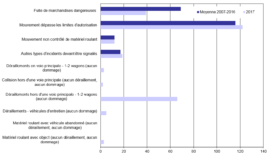 En 2017, 115 accidents mettant en cause des marchandises dangereuses sont survenus Note de bas de page 5; ce nombre est en hausse comparativement à 101 en 2016, mais en baisse comparativement à la moyenne décennale de 138. Il y a eu 4 accidents avec déversement de marchandises dangereuses en 2017, par rapport à 1 en 2016, mais ce nombre correspond à la moyenne sur 10 ans. Deux des 4 accidents ont provoqué une fuite de soufre liquide, 1 de chlorate de sodium et 1 de pétrole brut.