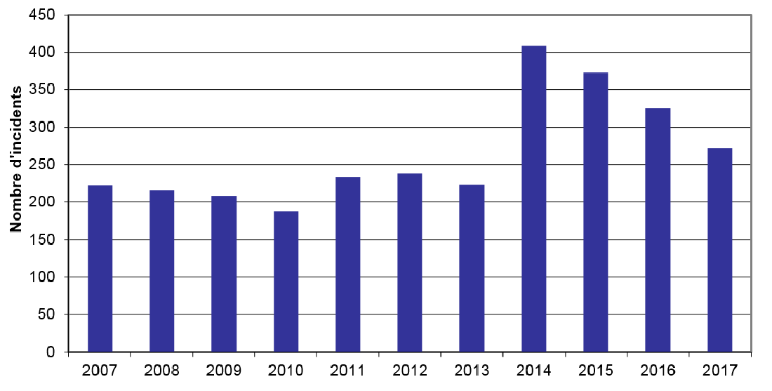 | Incidents devant être signalés par type | 223 | 216 | 209 | 188 | 233 | 238 | 224 | 408 | 373 | 325 | 272 |