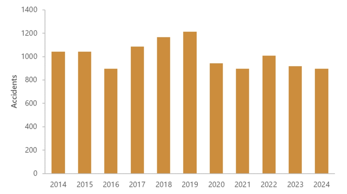 Les 896 accidents représentent une diminution de 2 % par rapport à 2023 et une diminution de 12 % par rapport à la moyenne décennale de 1021.