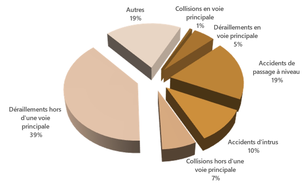 Les collisions et les déraillements en voie principale sont les catégories d’accidents ferroviaires les plus graves quant au risque potentiel pour le public et l’environnement (p. ex. lorsque des trains de voyageurs sont en cause ou que des marchandises dangereuses sont rejetées par des trains qui déraillent dans des zones peuplées).
