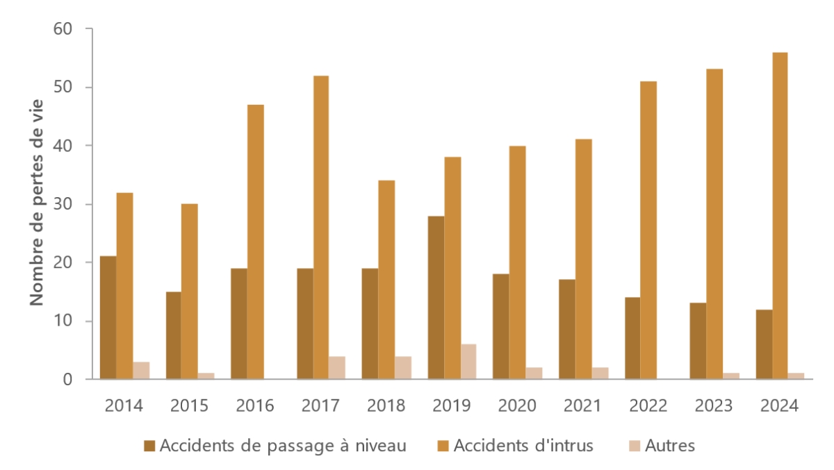 Les accidents ferroviaires (figure 3 et tableau 1) ont fait 69 pertes de vie en 2024, en hausse par rapport aux 67 pertes de vie l’année précédente et supérieur à la moyenne décennale de 62. Il y a eu 12 pertes de vie à des passages à niveau en 2024, soit une baisse comparativement aux 13 pertes de vie enregistrées en 2023, et moins que la moyenne décennale de 18. En 2024, 56 intrusLes accidents d’intrus mettent en cause des personnes, principalement des piétons, qui se trouvent sur l’emprise ferroviaire (autre que des passages à niveau) sans autorisation et qui sont heurtés par du matériel roulant, entraînant la mort, des blessures graves ou des dommages matériels. ont perdu la vie au cours d’accidents, en hausse par rapport aux 53 pertes de vie l’année précédente, et plus que la moyenne décennale de 42.