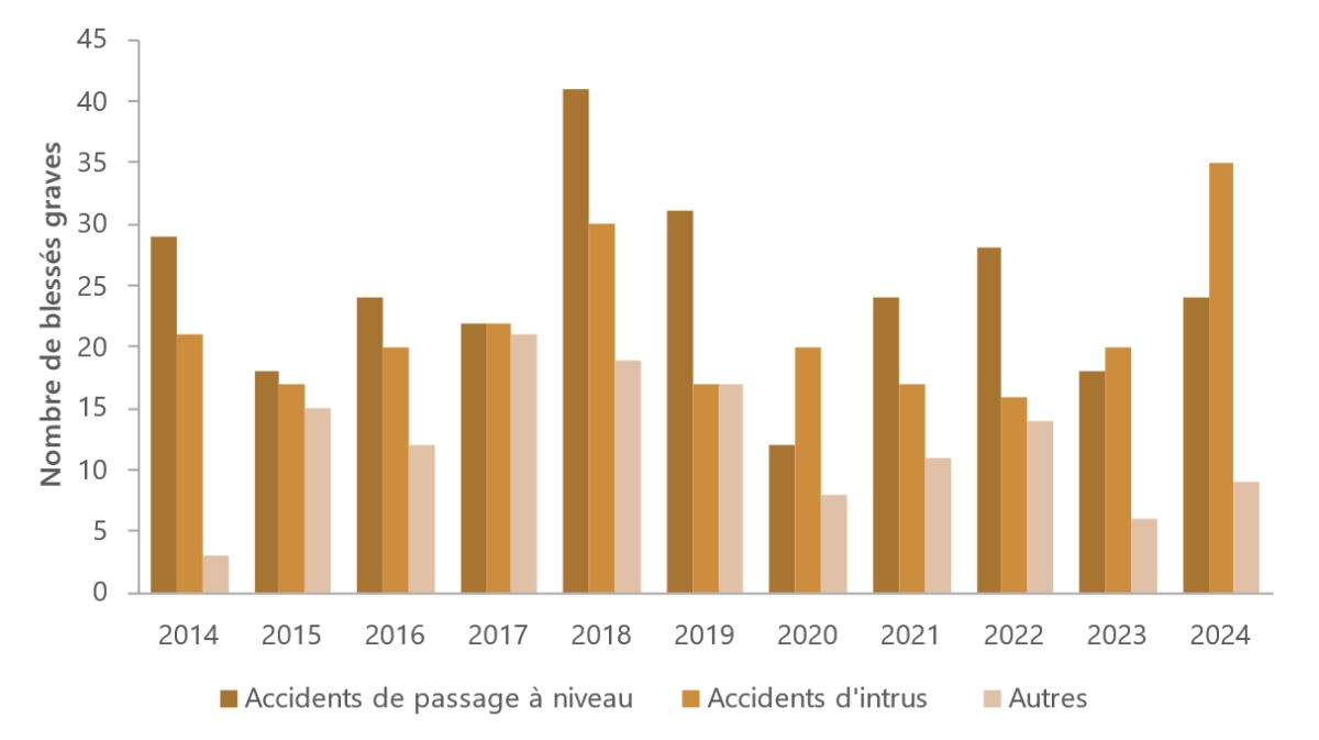 Les événements ferroviaires ont fait 68 blessés gravesVoir la section Définitions. en 2024 (figure 4 et tableau 1), ce qui correspond à une hausse par rapport à 2023 (44) et à la moyenne décennale de 57. Les accidents de passage à niveauLes accidents de passage à niveau surviennent lorsque le matériel ferroviaire roulant entre en collision avec un véhicule automobile ou avec un piéton, entraînant la mort, des blessures graves ou des dommages matériels. ont fait 24 blessés graves, en hausse par rapport à 18 en 2023 mais en deçà de la moyenne décennale de 25. Le nombre d’intrus gravement blessés était de 35 en 2024, en hausse par rapport aux 20 de l’année précédente et par rapport à la moyenne décennale de 20. Six employés de chemin de fer ont été gravement blessés en 2024, une hausse par rapport à 2023 (3), mais moins que la moyenne décennale (11) (tableau 2).
