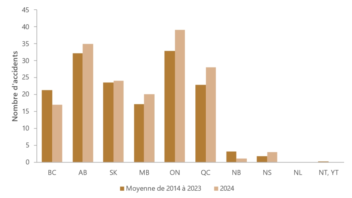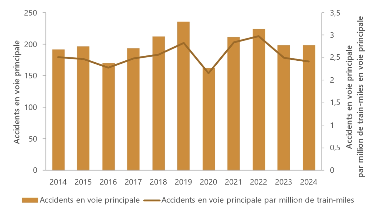 D’après les données de Transports Canada, en 2024, les activités ferroviaires en voie principale (autres que dans les gares de triage) ont augmenté de 3 % par rapport à 2023. Le taux d’accidents en voie principale en 2024 était de 2,4 accidents par million de trains-milles en voie principale, soit une baisse par rapport au taux de 2,5 en 2023 et une baisse par rapport à la moyenne décennale de 2,6.