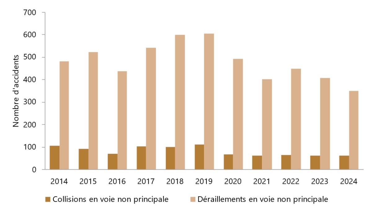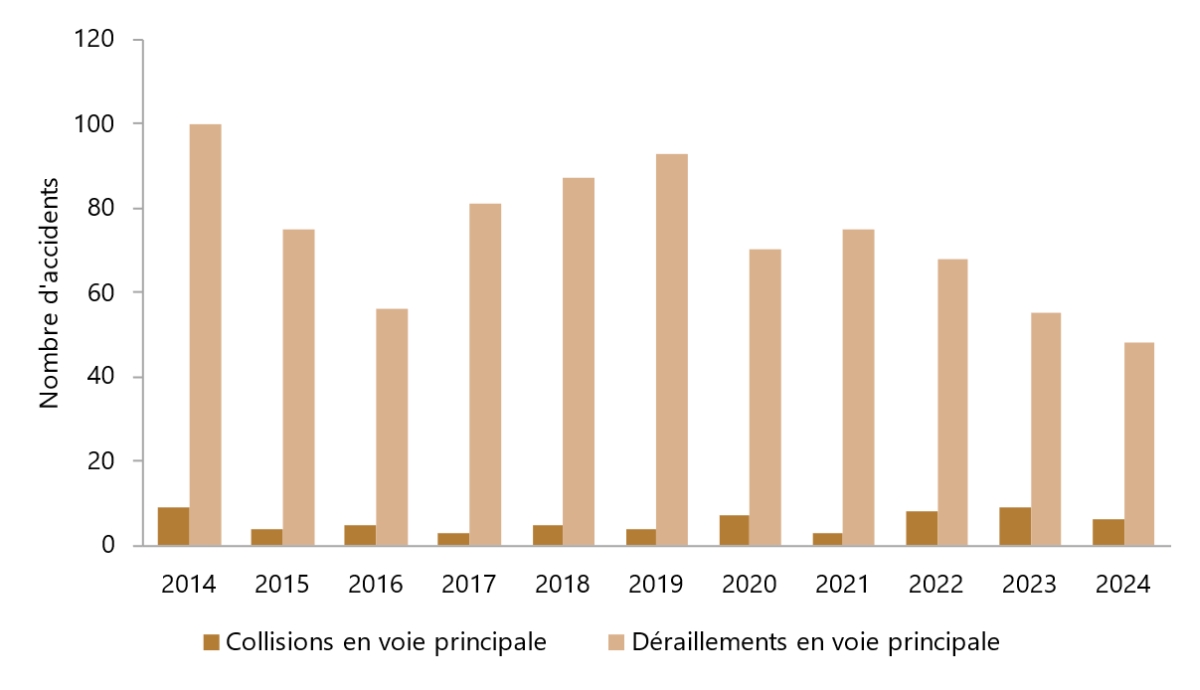 La proportion des accidents de déraillement en voie principale en 2024 (soit 5 %) était en baisse par rapport à l’année précédente (6 %) et à la moyenne décennale (7 %).