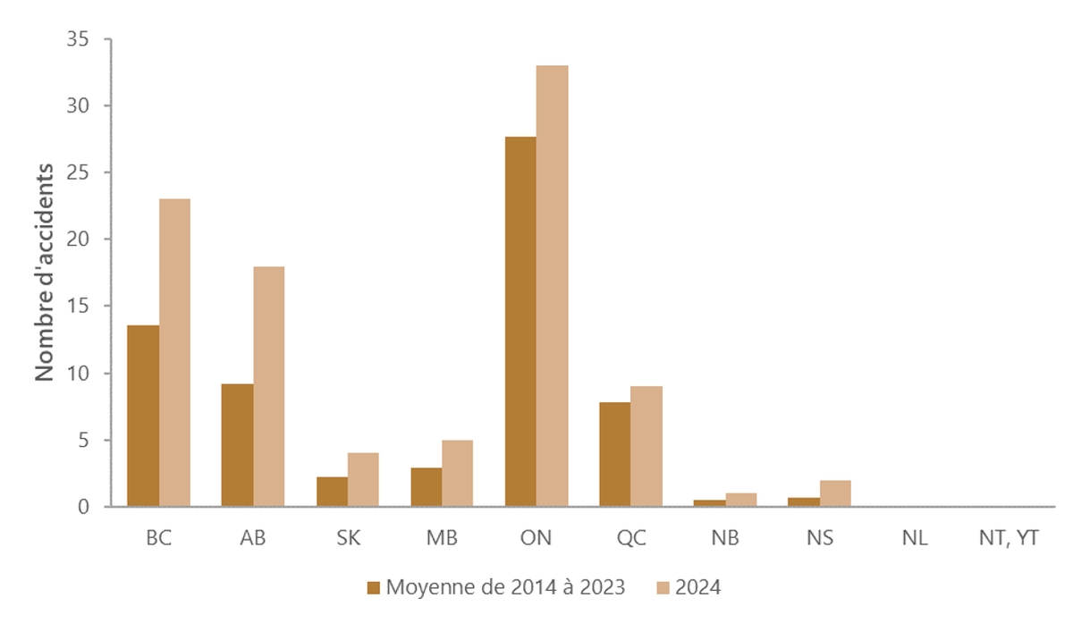 On a signalé un total de 48 déraillements en voie principale (tableau 4) en 2024, soit une baisse par rapport au total de 55 signalés en 2023, et 37 % de moins que la moyenne décennale de 76 (figure 6). Trente-trois pour cent des 48 déraillements en voie principale sont survenus en Alberta, 21 % en Ontario et 19 % en Colombie-Britannique.