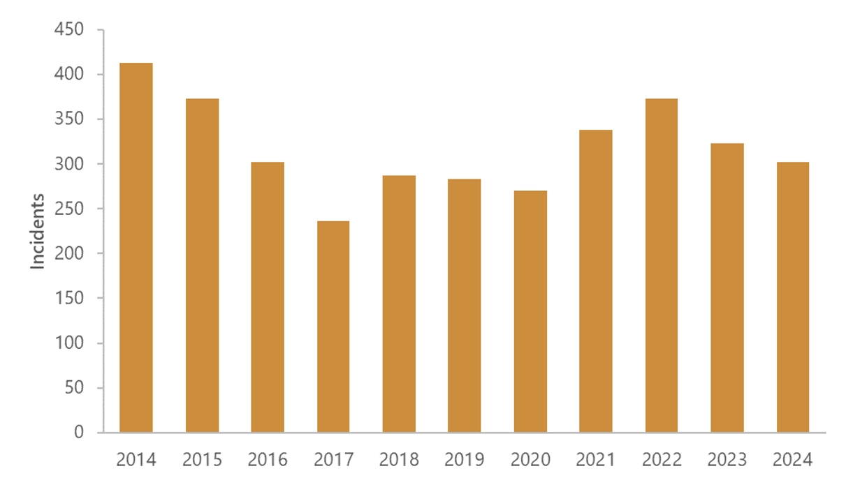 En 2024, 302 incidents de transport ferroviaire ont été signalés au BST, soit une baisse de 7 % par rapport à 2023 (323). Les incidents dus à des mouvements qui dépassaient les limites d’autorisation correspondaient à 47 % (143) de tous les incidents de transport ferroviaire en 2024. Ce nombre a diminué de 19 comparativement à 2023, mais est supérieur à la moyenne décennale de 135.