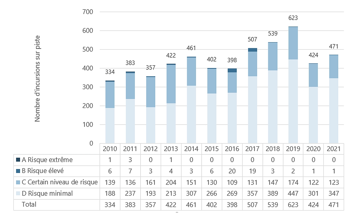 En 2021, NAV CANADA a recensé 471 incursions sur piste.