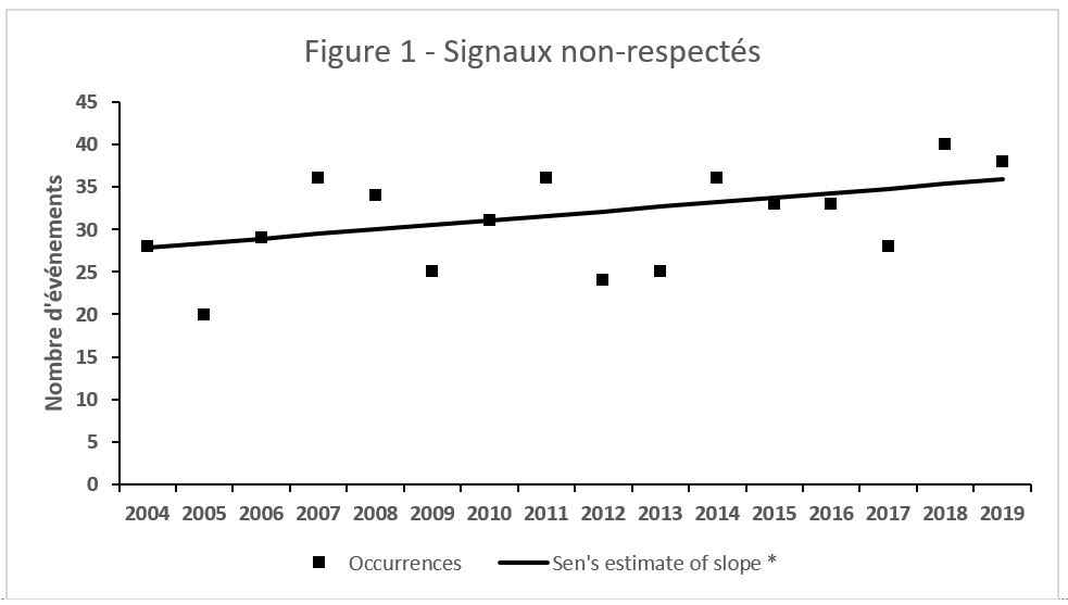 Depuis 2004, on a signalé en moyenne 31 événements par année au cours desquels une équipe de train n’a pas réagi de la bonne façon à une indication de signal sur le terrain, et le nombre d’événements de ce type qui se produisent chaque année augmente. Les années 2018 et 2019 présentent le nombre d’événements le plus élevé, soit 40 et 38 respectivement (figure 1).