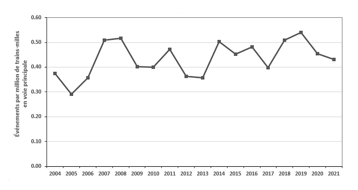 Figure 1. Événements de transport ferroviaire mettant en cause des signaux non respectés par million de trains-milles en voie principale, de 2004 à 2021 (Source : BST)
